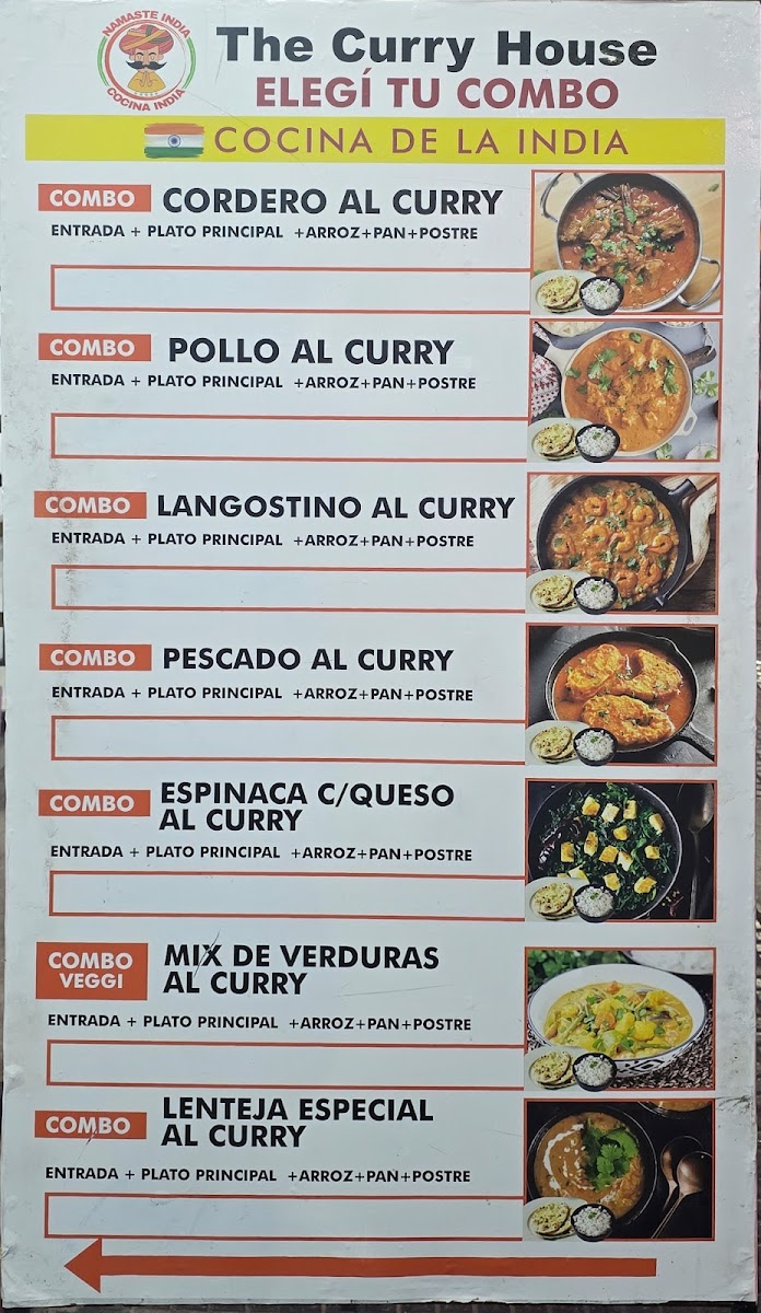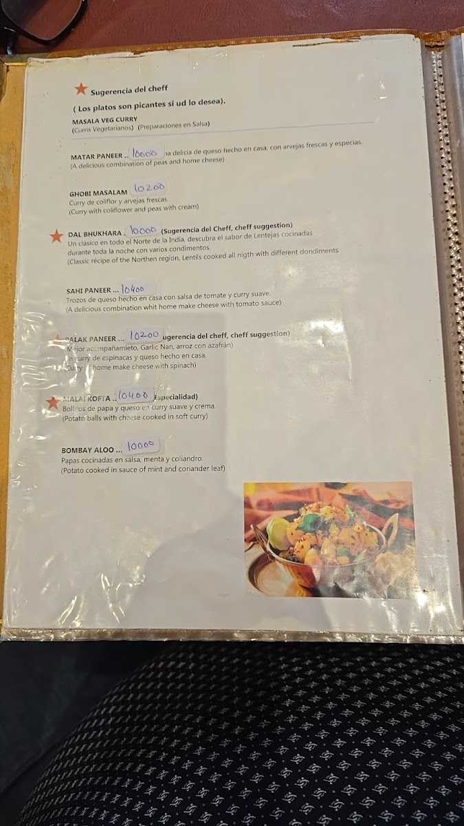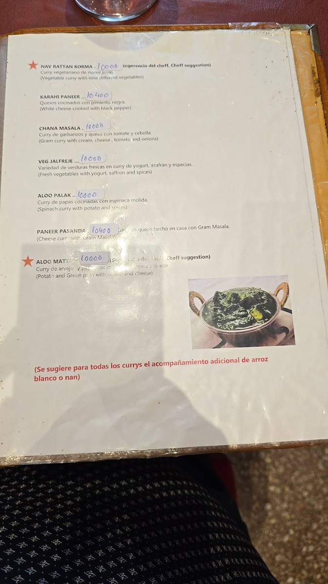 Vegetarian and vegan diners will find plenty of options in the Vegeterianos Y Veganos section, featuring dishes like Mattar Paneer (cottage cheese with peas), Nav Rattan Korma (a mild curry with mixed vegetables), and Aloo Palak (potatoes and spinach), alongside other plant-based delights.
