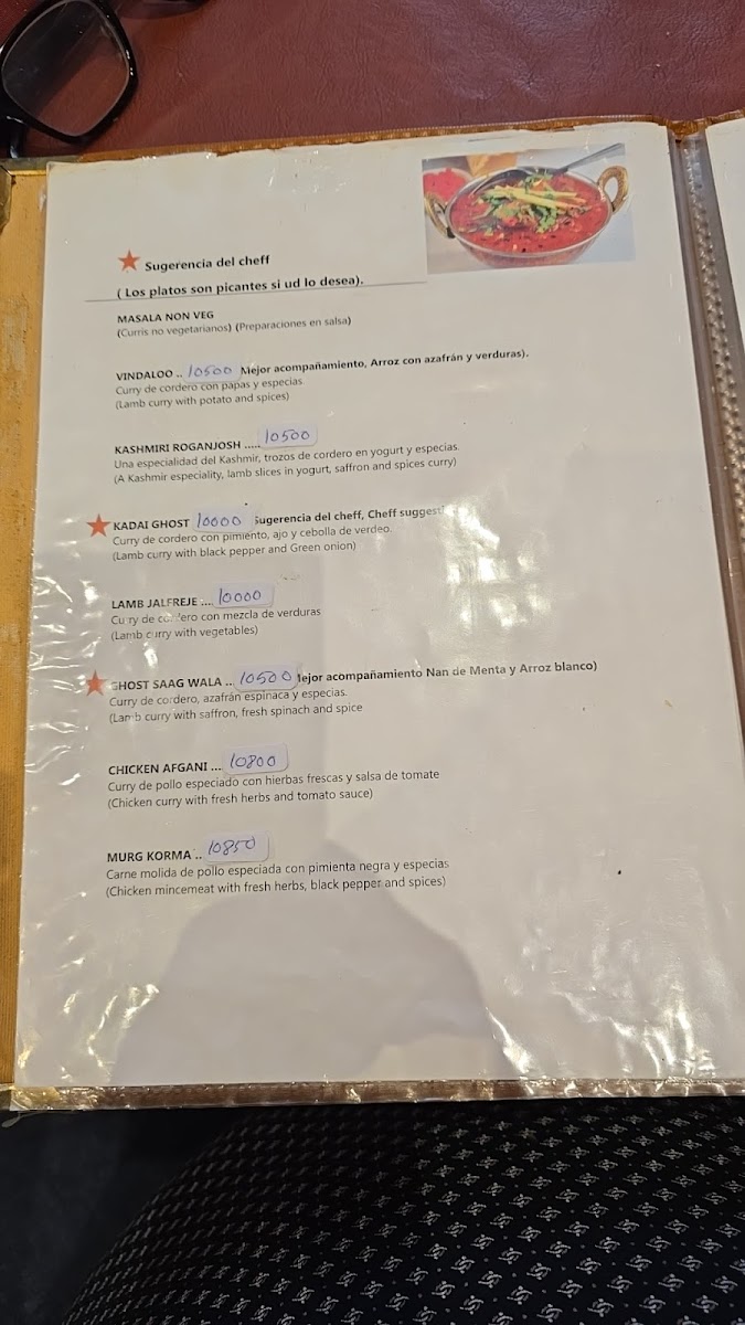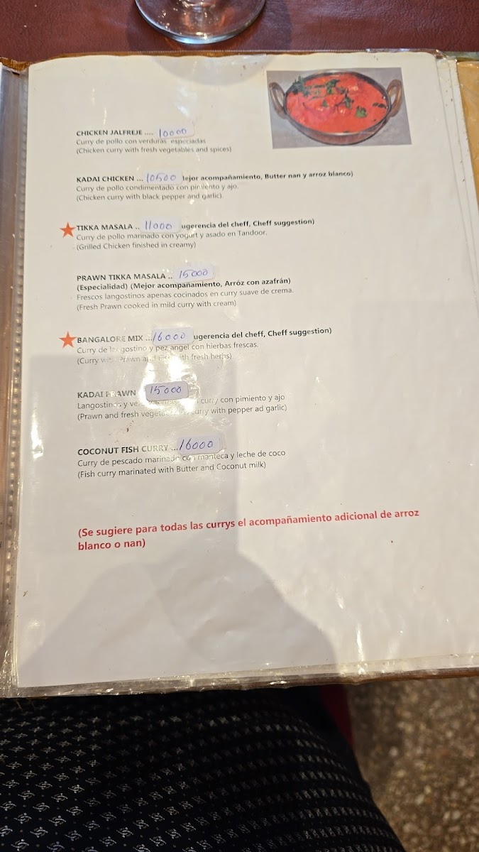 For those craving lamb, the Cordero section delivers a variety of hearty dishes, such as Kadai Ghost (lamb cooked in a rich, spicy sauce), Muglai Handi Ghost (a royal lamb curry with aromatic spices), and Ghost Saag Wala (lamb with spinach in a savory blend of spices).