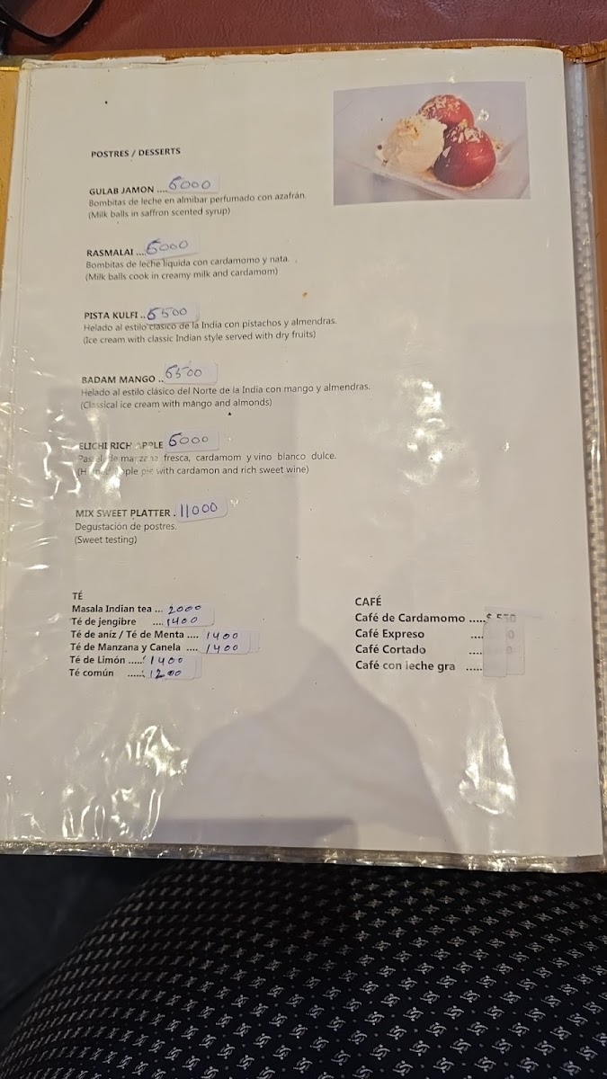 Degustación de entrada samosas empanas típicas de la india, veg pa ko ra rebozados vegetarianos, chicken pa ko ra rebozados de pollo. Plato principal dos platos a elección acompañados con arroz con azafrán y una selección de pan. Lección degustación de postre.- gulab jamón bombitas de leche con azafrán, rasmalai bombitas de leche con cardamomo y elichi pastel de manzana.